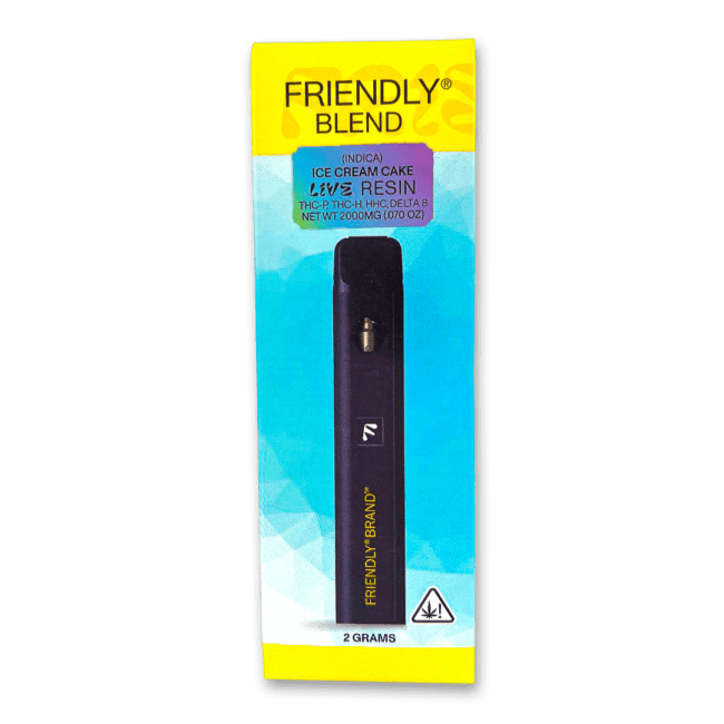 For those who want to experience the rich, creamy goodness of Ice Cream Cake try vaping a Friendly Blend 2000MG ice cream cake disposable vape. This pre-filled disposable vape captures the essence of the strain’s flavor and calming effects, offering a way to enjoy Ice Cream Cake in a convenient, legal format. Paired with 4 powerful cannabinoids and Live Resin, you’re in for the ultimate chill. Not to mention, this mess-free and hassle-free disposable is perfect for on-the-go use, offering convenience and quality in one sleek package (already contains the built-in battery, tank, and coil).