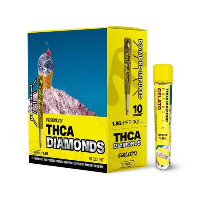 Get ready to indulge with the Friendly 1.8G Gelato THCA Diamond Preroll—where flavor meets potency! Infused with premium THCA diamonds, this preroll delivers a powerful and uplifting experience, making it ideal for unwinding or finding relief. The infusion elevates the rich, creamy flavor and aroma, ensuring every puff is a treat for your senses. Expertly rolled for a smooth, even burn, it offers a consistent and enjoyable smoke from start to finish. Whether you’re after a bold experience or a flavorful escape, the Gelato THCA Diamonds Preroll strikes the perfect balance. Don’t miss out—treat yourself today!